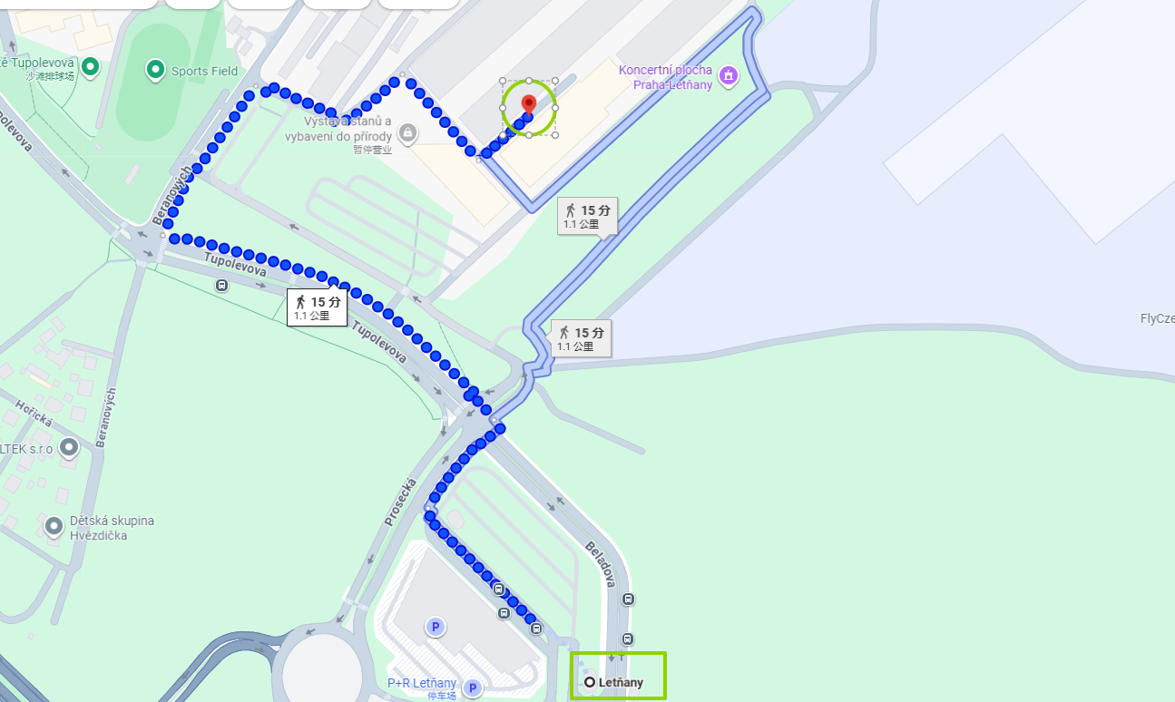 Letňany (metro C) + gutxi gorabehera. 15 minutu oinez