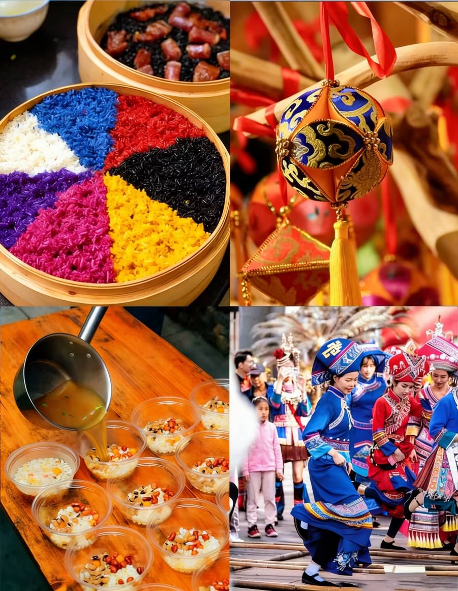 Kantua egiteaz gain, landareen zukuez tindatutako Bost Kolore Arroz Glutinosoa prestatuz, bola brodatuak jaurtiz, banbuzko pole-dantzak dantzatuz eta brontzezko danborrak jotzen dituzte.